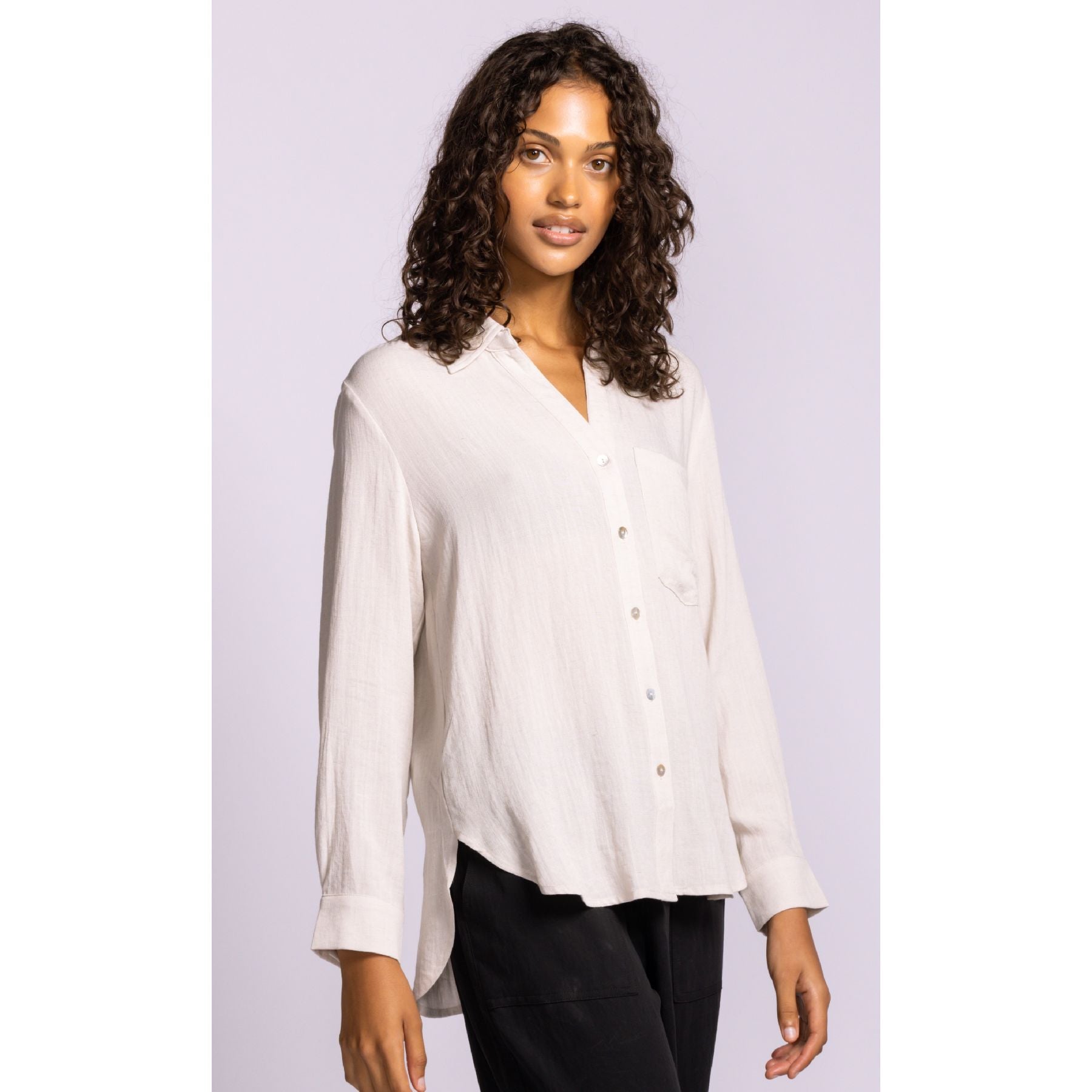 A classic button-front design, subtle collar, and single chest pocket keep it timeless, while the slightly curved hem makes it easy to wear tucked, half-tucked, or left loose. The neutral tone makes it endlessly versatile, pairing seamlessly with tailored trousers for work or denim for an elevated everyday look. It is polished, breathable, and thoughtfully simple.