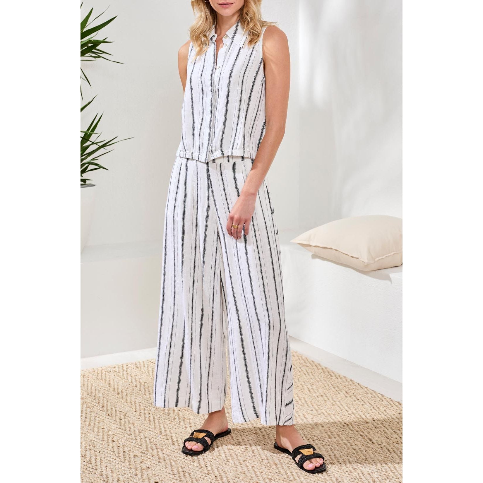 Easy, breezy, and quietly polished. This sleeveless shirt features a clean hidden placket and a softly gathered elastic waist that creates a flattering shape without feeling fussy. The subtle vertical stripe adds a tailored touch, while the linen-rayon blend keeps the fabric light, breathable, and beautifully draped. It pairs effortlessly with matching pieces or simple denim for a look that feels relaxed but still thoughtfully put together.