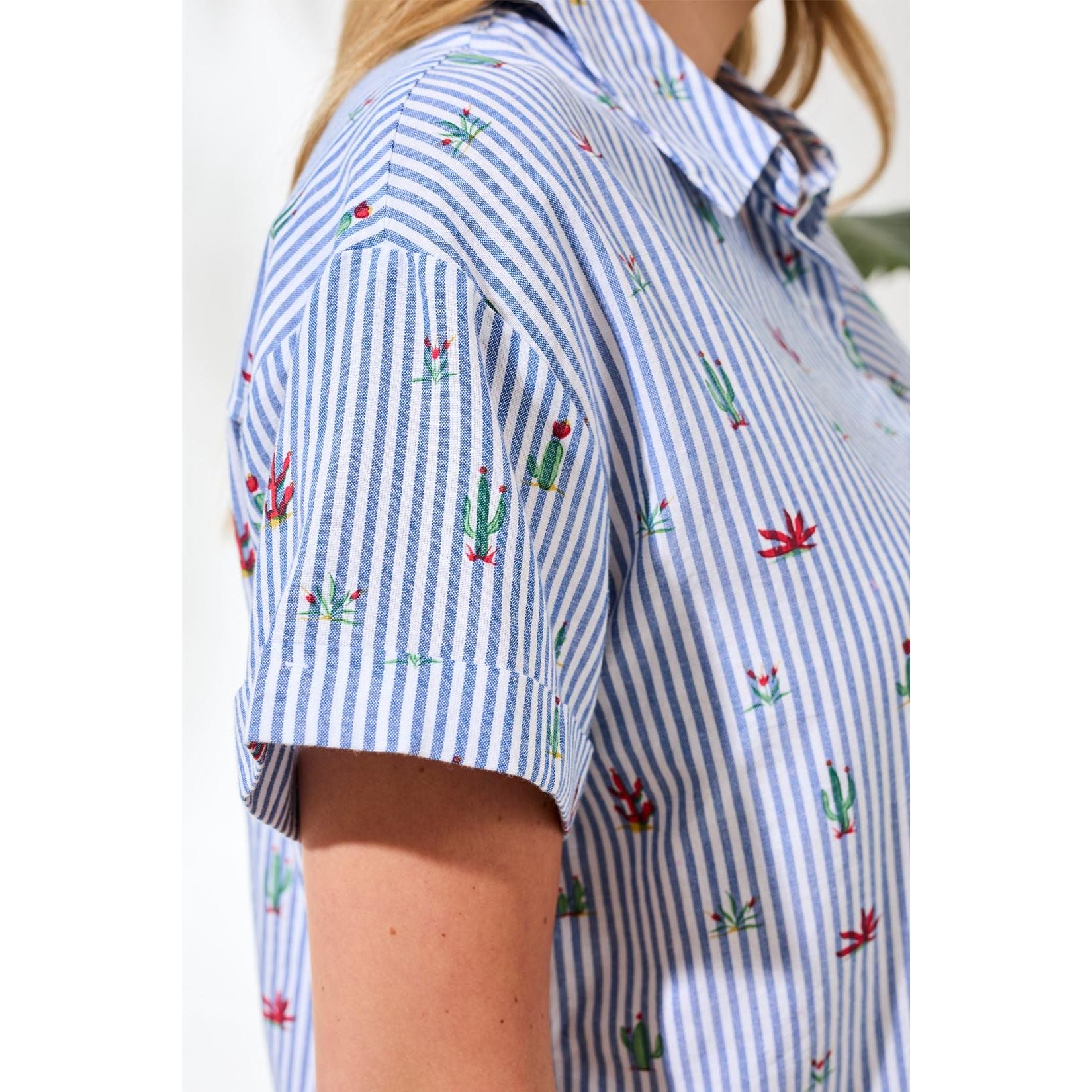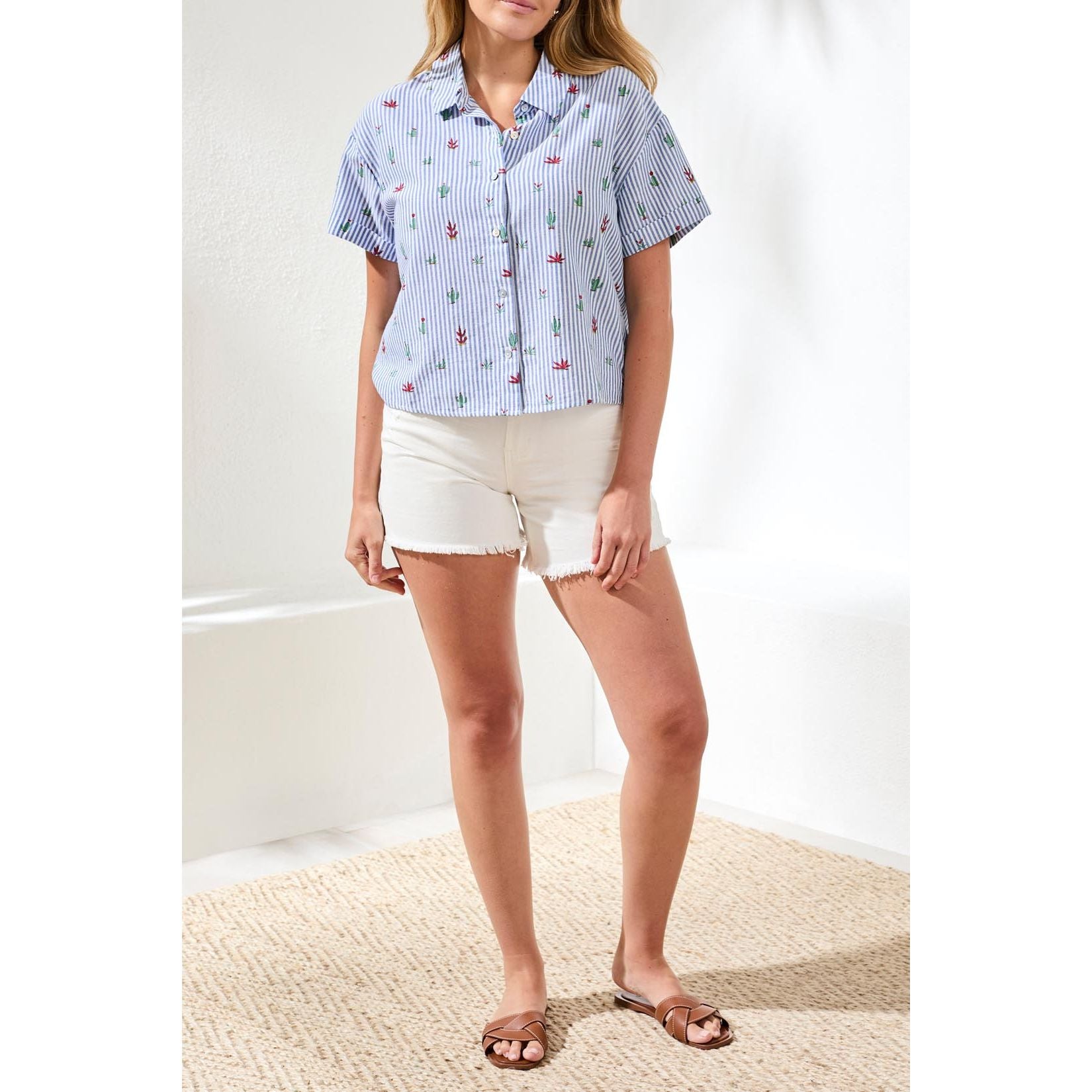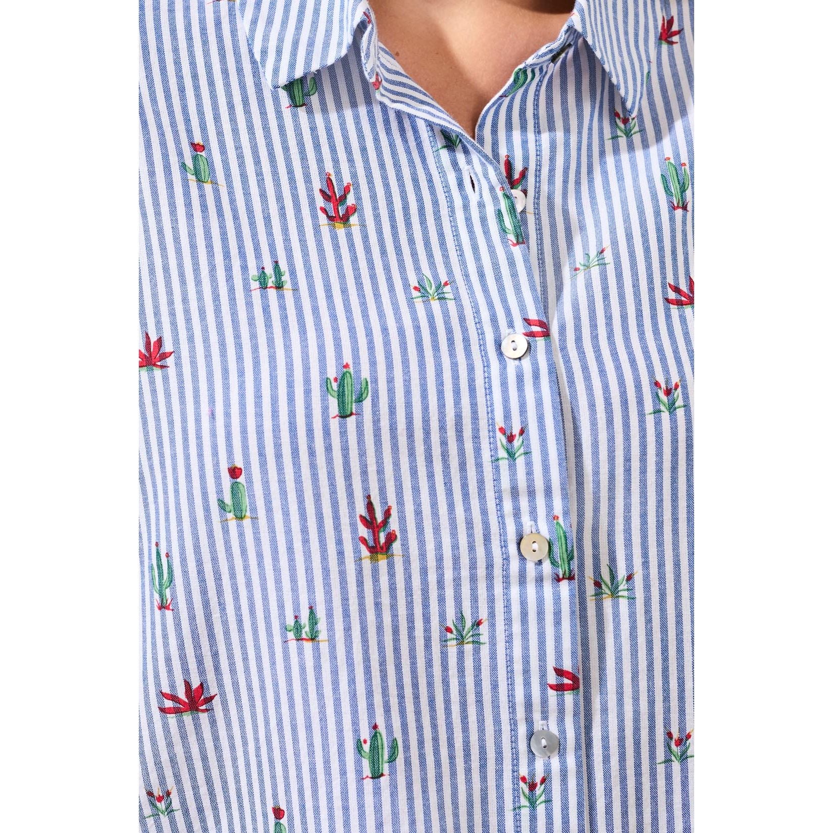 A fresh take on a classic summer shirt. This short sleeve button front blouse features crisp blue stripes scattered with playful embroidered cactus motifs, giving it just the right touch of personality. The lightweight cotton fabric keeps things breathable and comfortable, while the relaxed shape makes it easy to wear tucked, untucked, or layered over a tank. It’s the kind of piece that feels polished but still has a sense of fun.