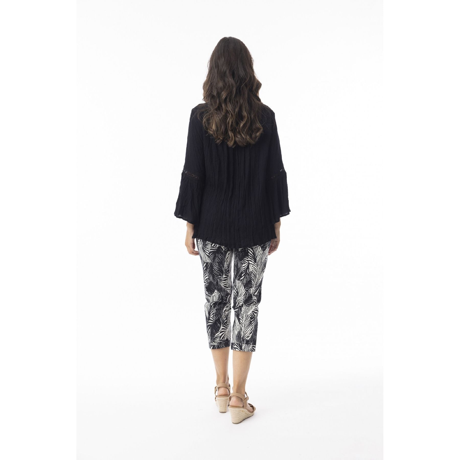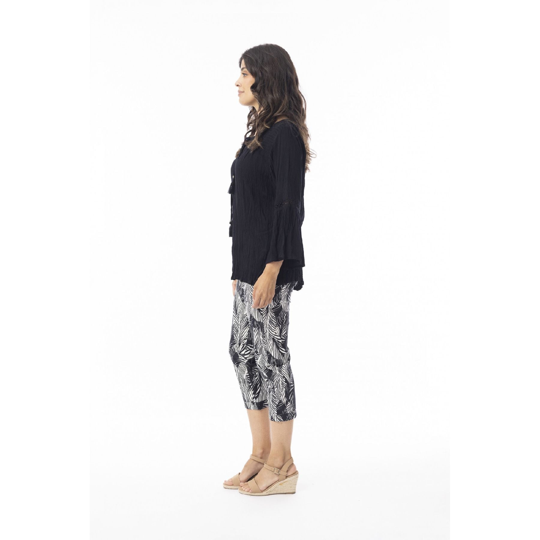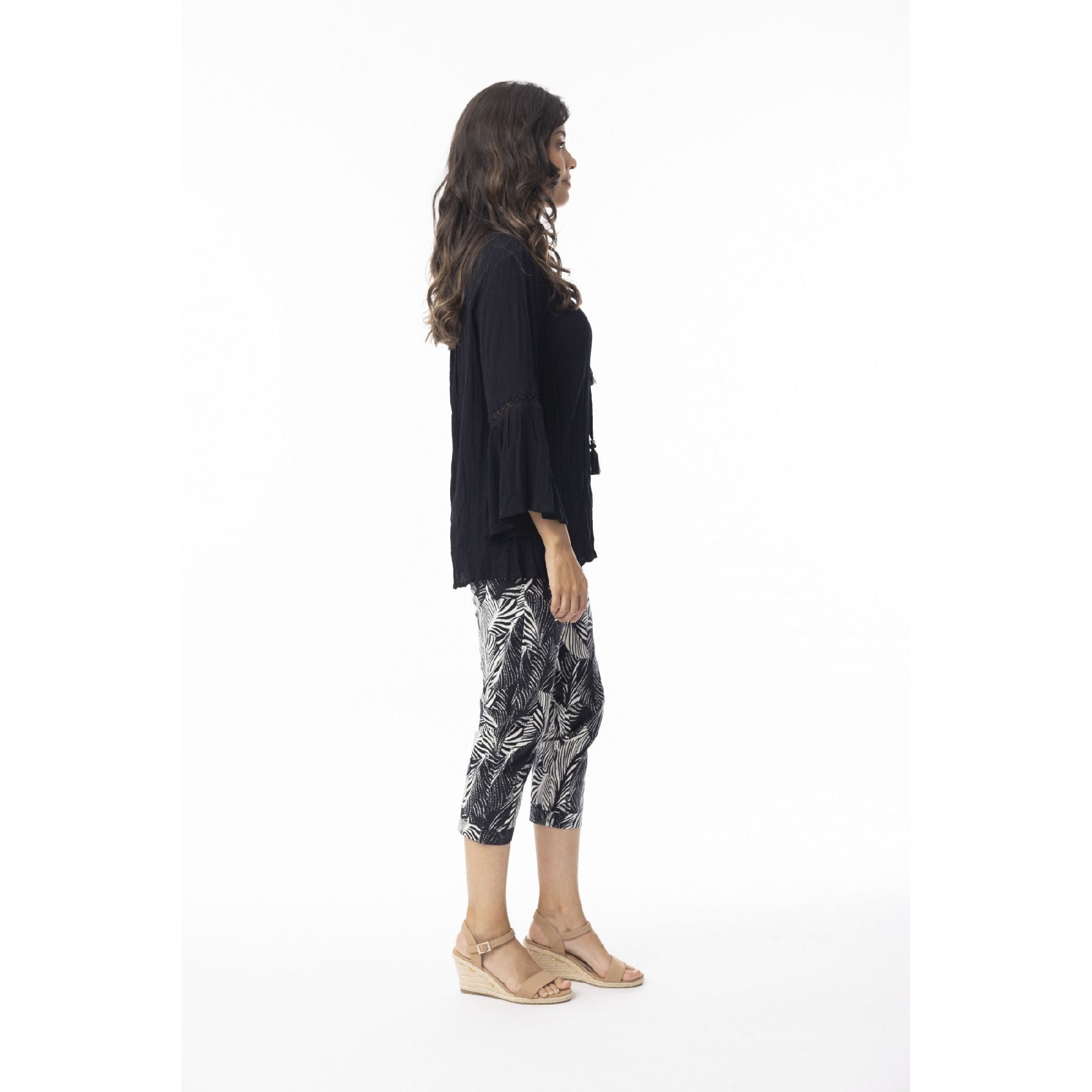 The Arashi Pant is a warm-weather staple with just enough attitude. Designed with a cropped length and a bold black-and-white botanical print, it brings interest to even the simplest outfit. The soft stretch fabric keeps things comfortable, while the clean silhouette makes it easy to dress up with a blouse or keep casual with a tee. A great option when you want something polished that still feels effortless.