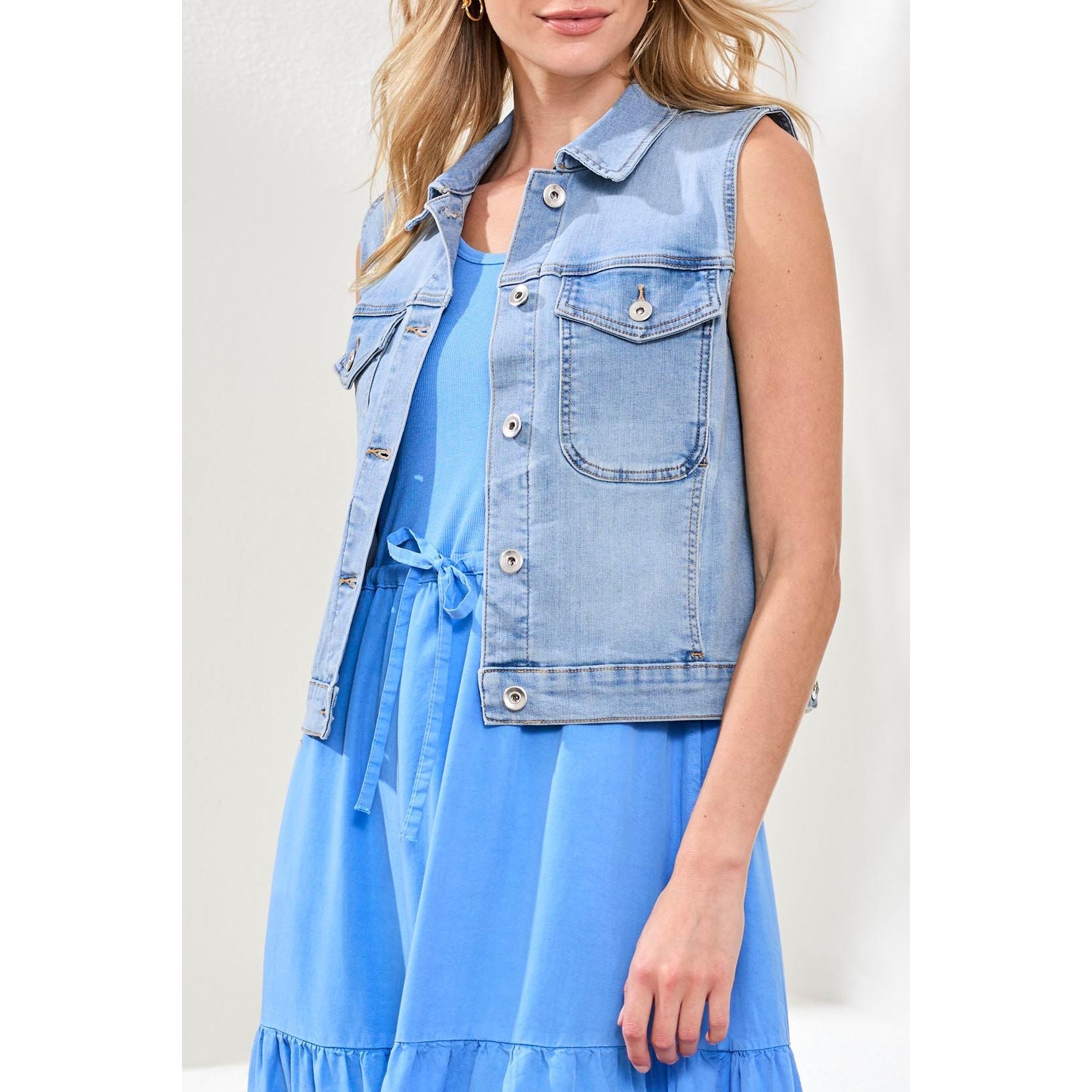 Elevate your layers with this Sleeveless Denim Jacket, meticulously crafted in Vision Stretch Comfort Denim for structure and freedom of movement. Featuring functional patch pockets and a clean Desert wash, this jacket is designed for relaxed, confident styling. Enjoy a premium hand feel and modern shape that makes this an essential for transitional weather and all-season outfitting, whether dressed up or down.
