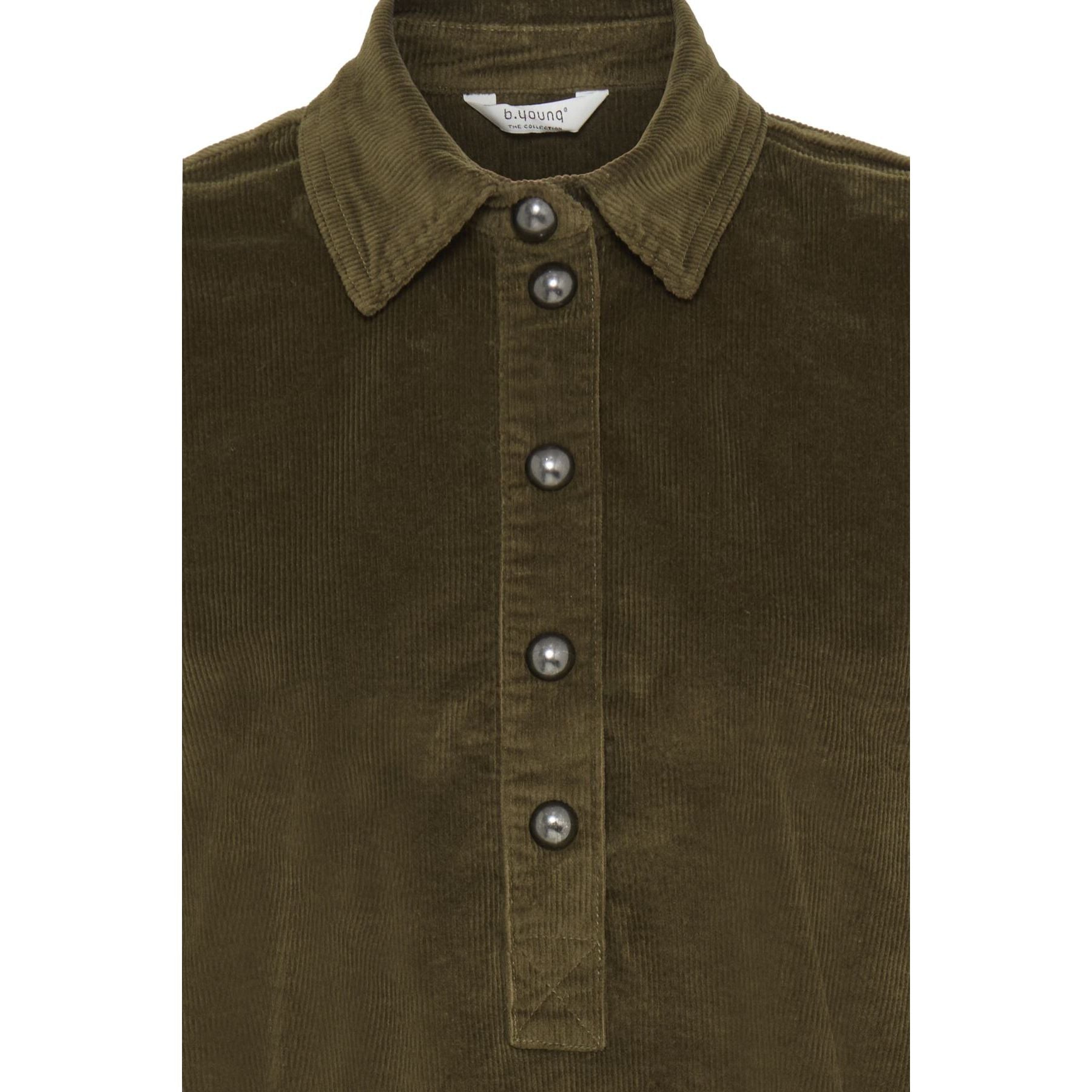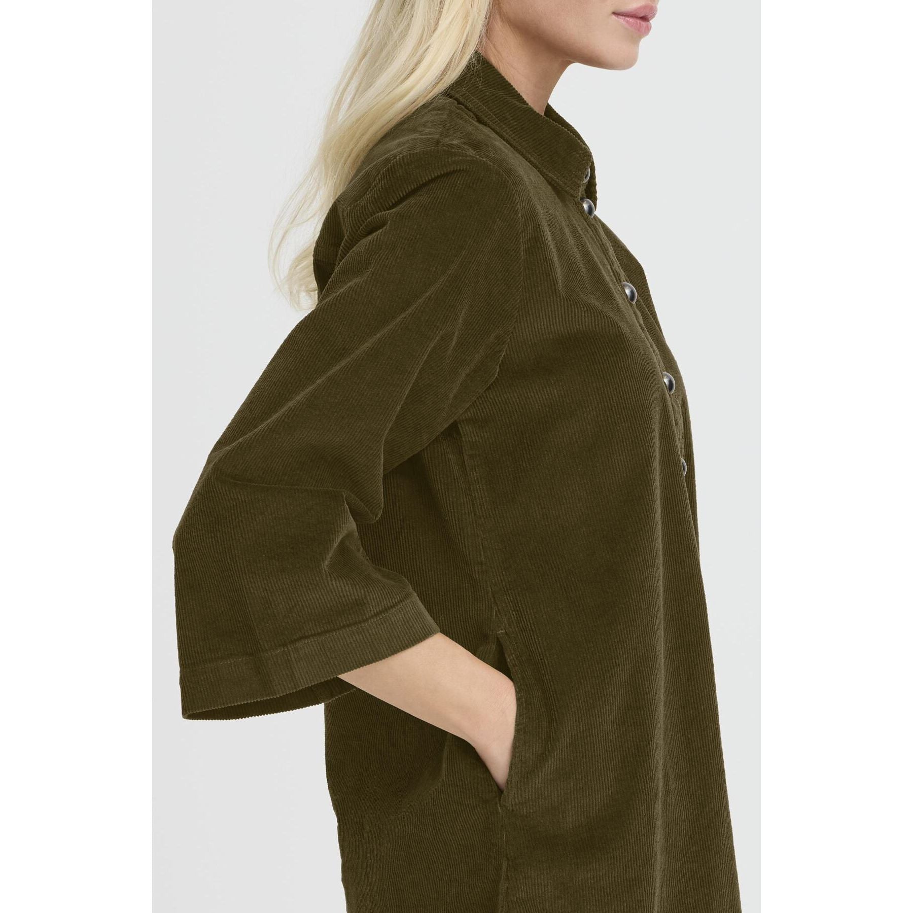 Meet the Dasik Dress: where classic corduroy gets a fresh, modern twist. This olive-toned shirt dress serves understated cool with its straight-cut silhouette, wide ¾ sleeves, and that crisp collared neckline. Shiny button details and subtle side pockets add just the right amount of structure and charm, while the soft stretch cotton blend keeps things comfortable all day. Wear it now with loafers and later with tights and boots—it's the kind of piece that adapts to your vibe, not the other way around.