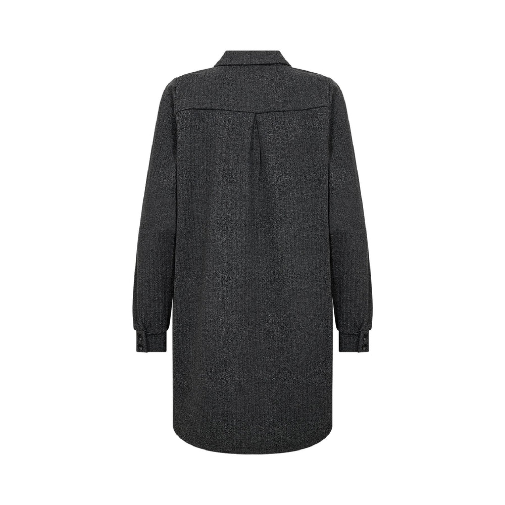 The Vinja Tunic is a chic nod to effortless dressing, blending timeless tailoring with modern ease. Crafted in a deep charcoal hue, it features a refined point collar, partial button placket, and subtle chest seam detailing for a touch of structure. The long sleeves are finished with buttoned cuffs, while the straight silhouette and curved hem give it a relaxed, versatile feel—perfect for layering over leggings, trousers, or even worn solo as a tunic dress. Its soft, mid-weight fabric offers just the right balance of drape and comfort, making it an easy go-to for both workdays and weekends.