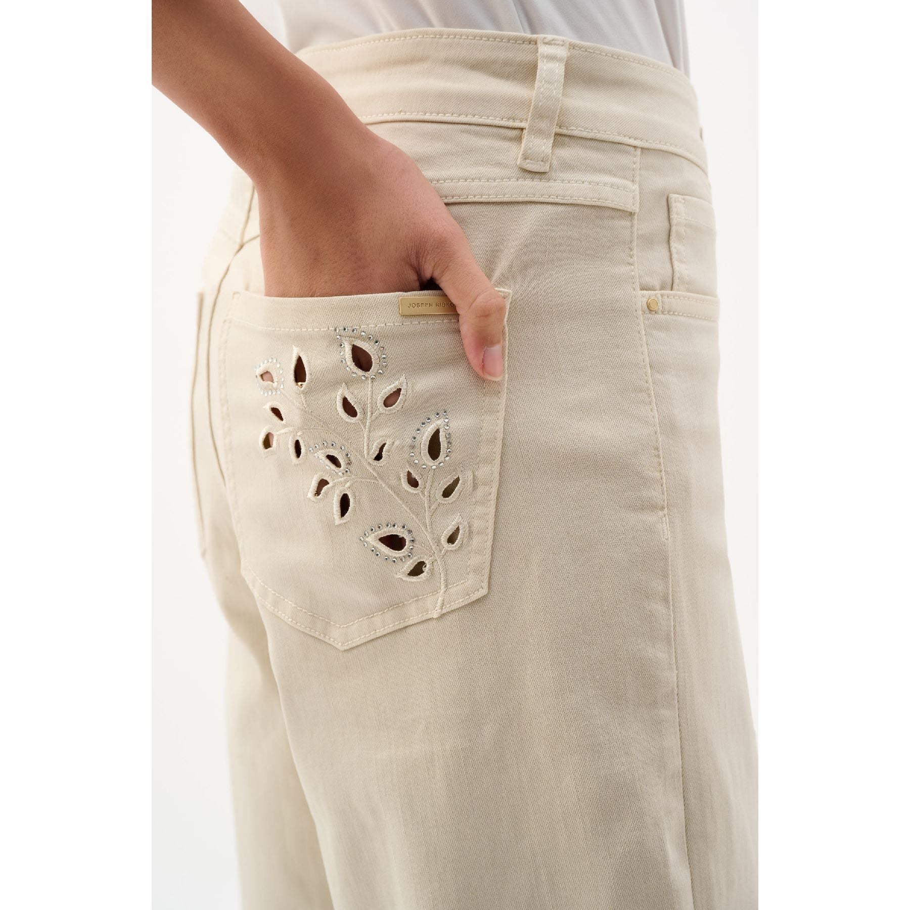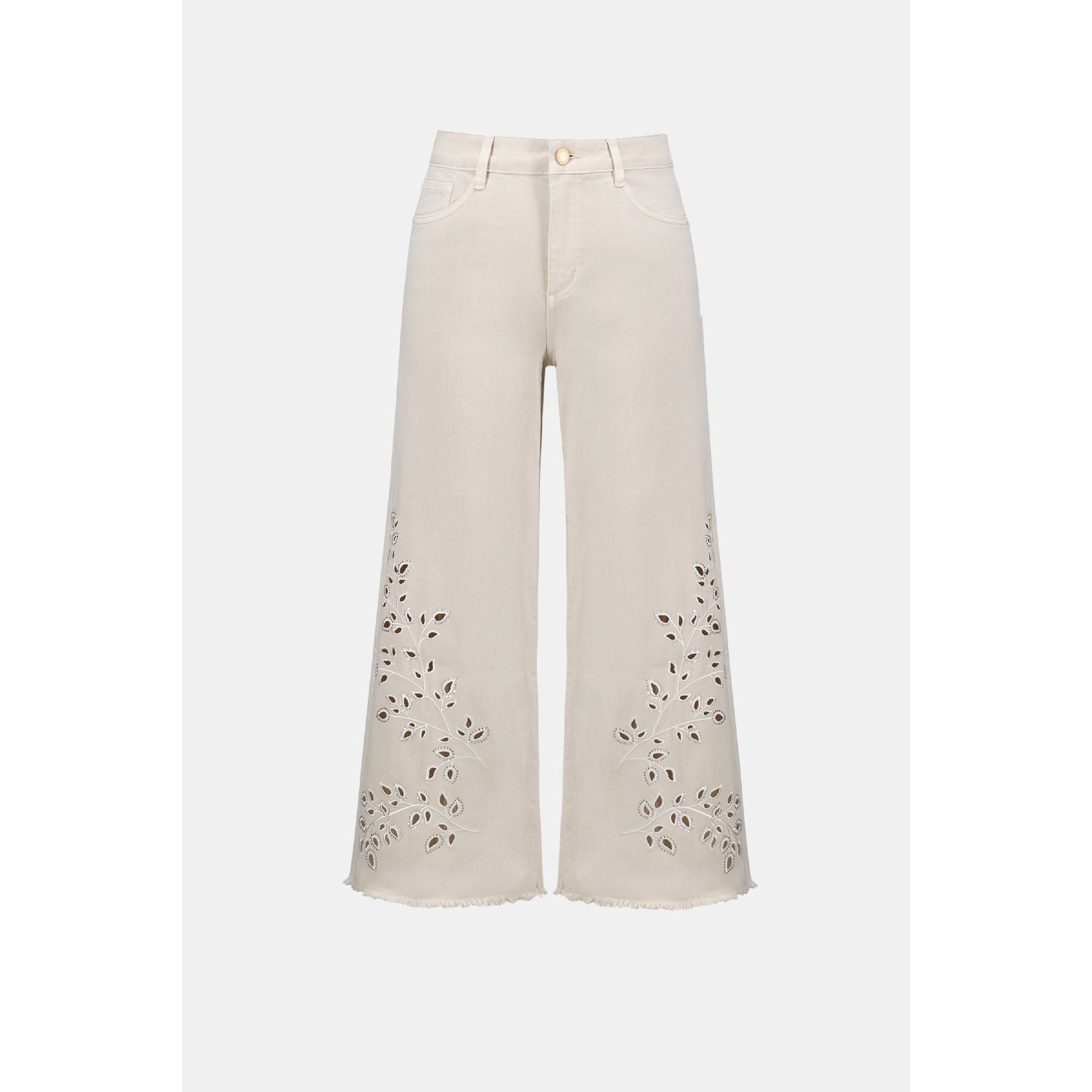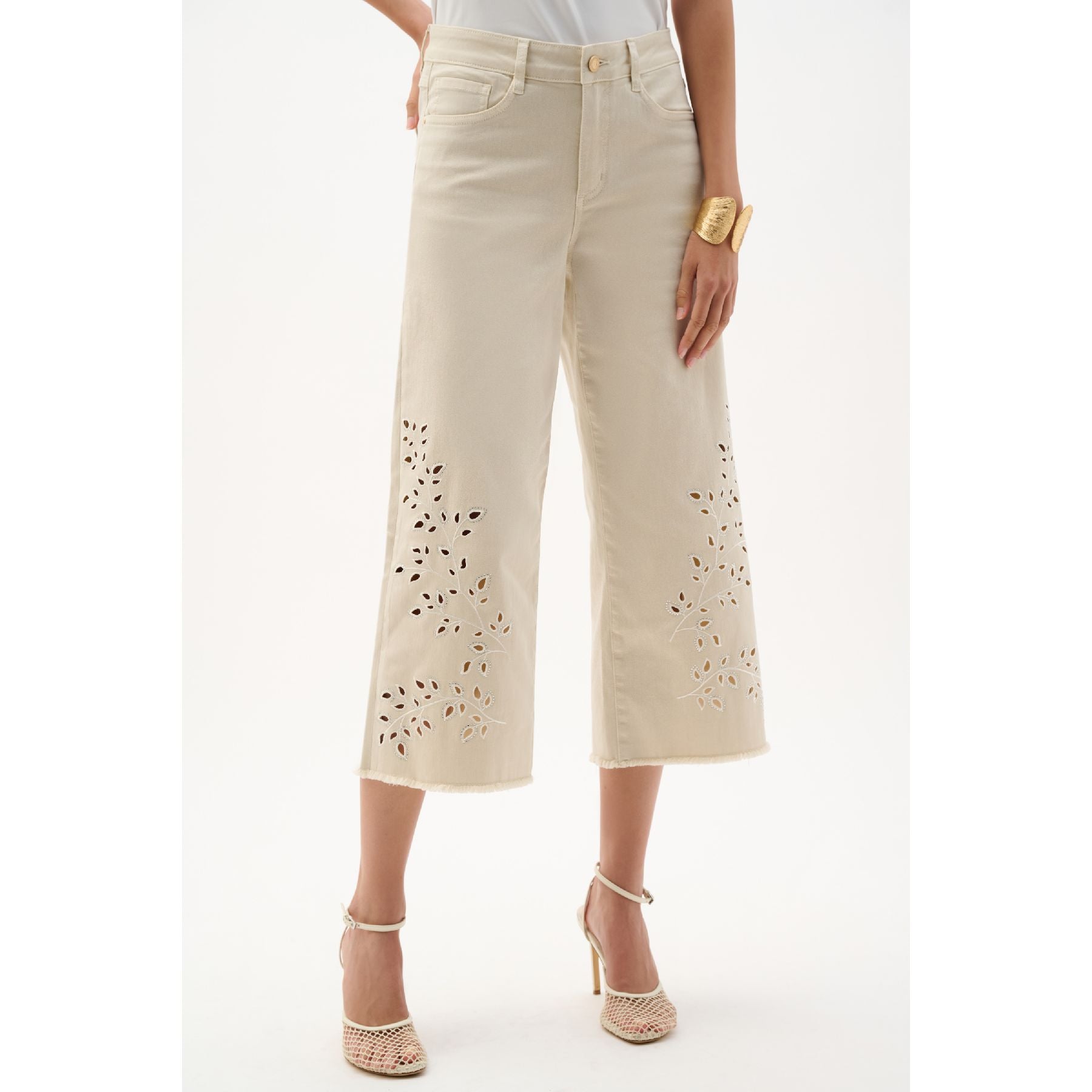 Made from a sustainable Repreve denim blend, these wide leg crop jeans feature eyelet embroidery at the legs and back pocket for a feminine twist. Rhinestone heat-transfer accents and a frayed hem complete the casual look. Based on our Goldie fit, they deliver a modern silhouette with familiar ease. Jeans made to be better. Repreve®, a polyester fabric made from recycled plastic bottles.
