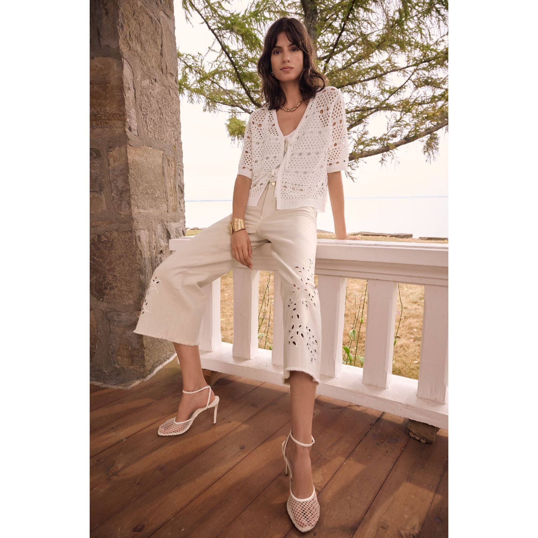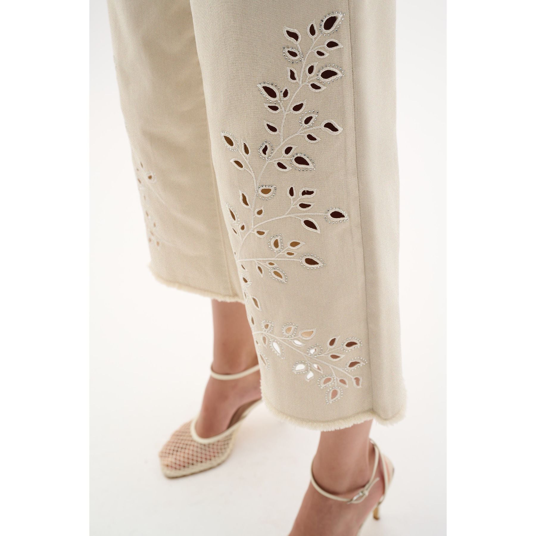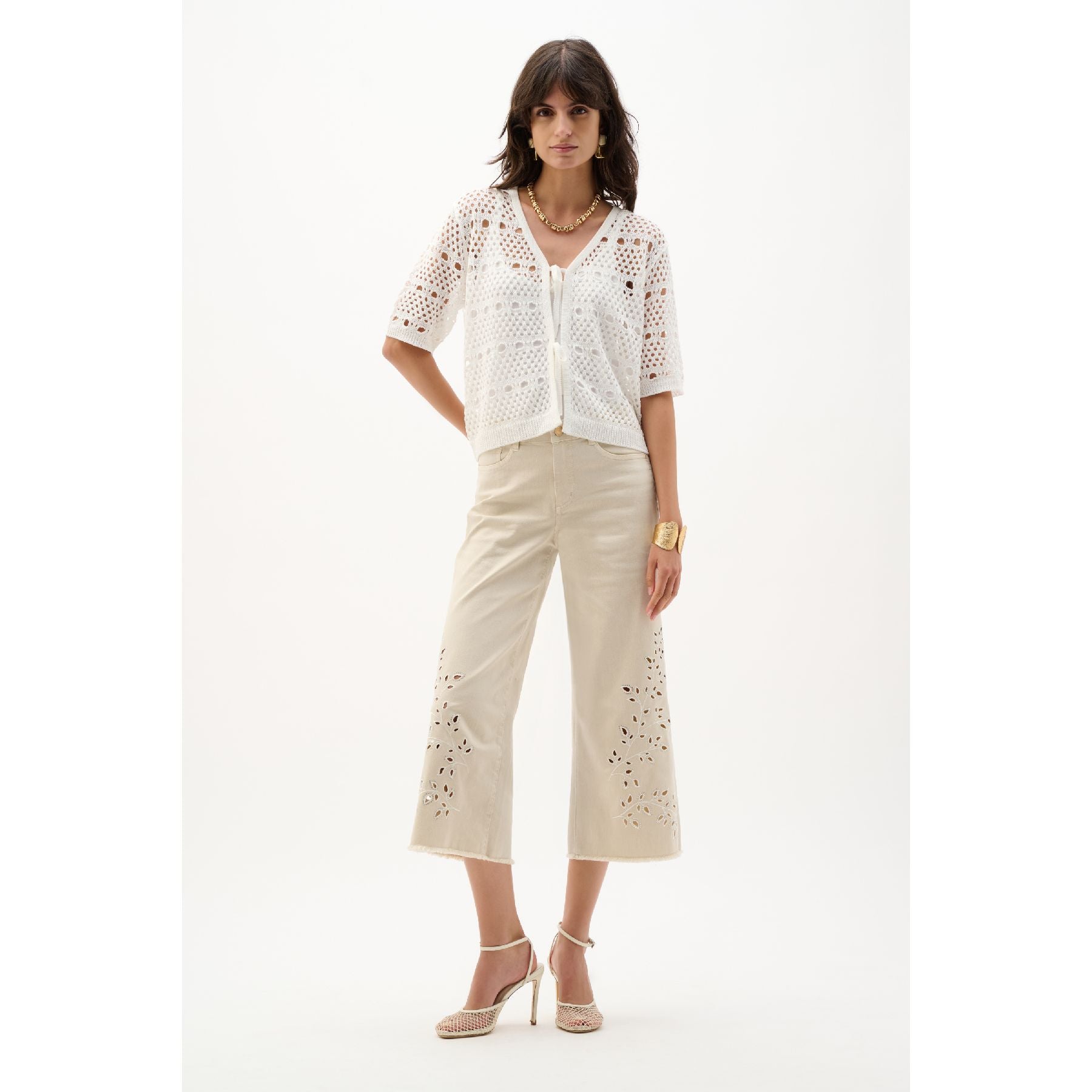 Made from a sustainable Repreve denim blend, these wide leg crop jeans feature eyelet embroidery at the legs and back pocket for a feminine twist. Rhinestone heat-transfer accents and a frayed hem complete the casual look. Based on our Goldie fit, they deliver a modern silhouette with familiar ease. Jeans made to be better. Repreve®, a polyester fabric made from recycled plastic bottles.