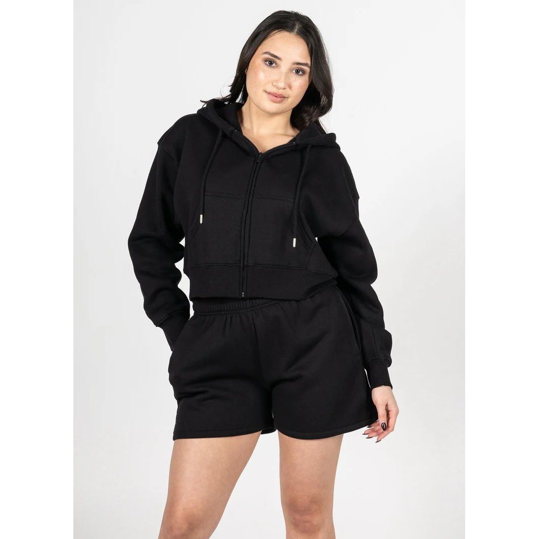 Designed with a full zip front, adjustable drawstring hood, and front pockets, it blends comfort and practicality in one easy piece. Pair it with the matching fleece shorts for a coordinated set, or style it over a tank and denim for an elevated off-duty look. Clean, minimal, and endlessly wearable.