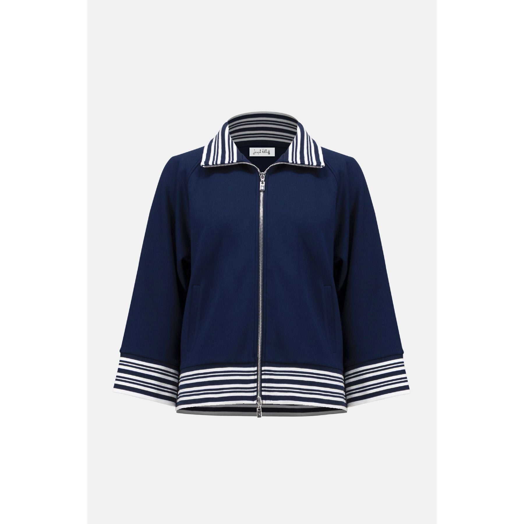 This scuba jersey jacket blends sporty flair with polished edge. Featuring a metallic front zipper, striped rib trim and three-quarter raglan sleeves, it’s made for easy layering without compromising style.