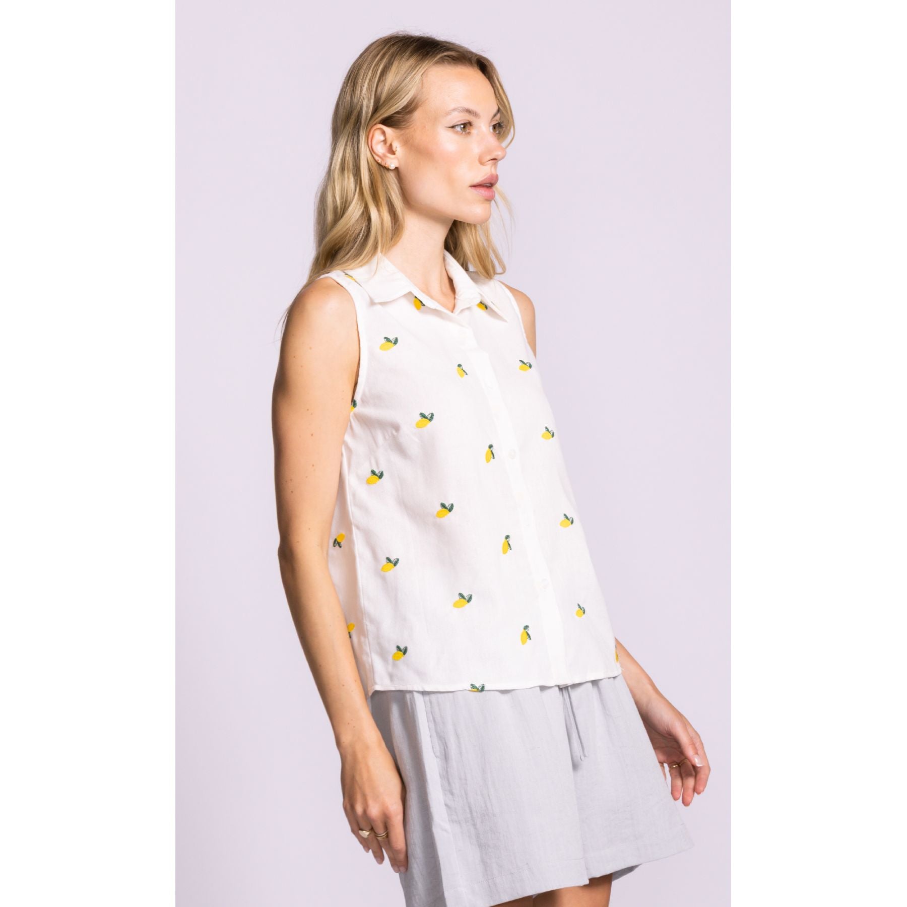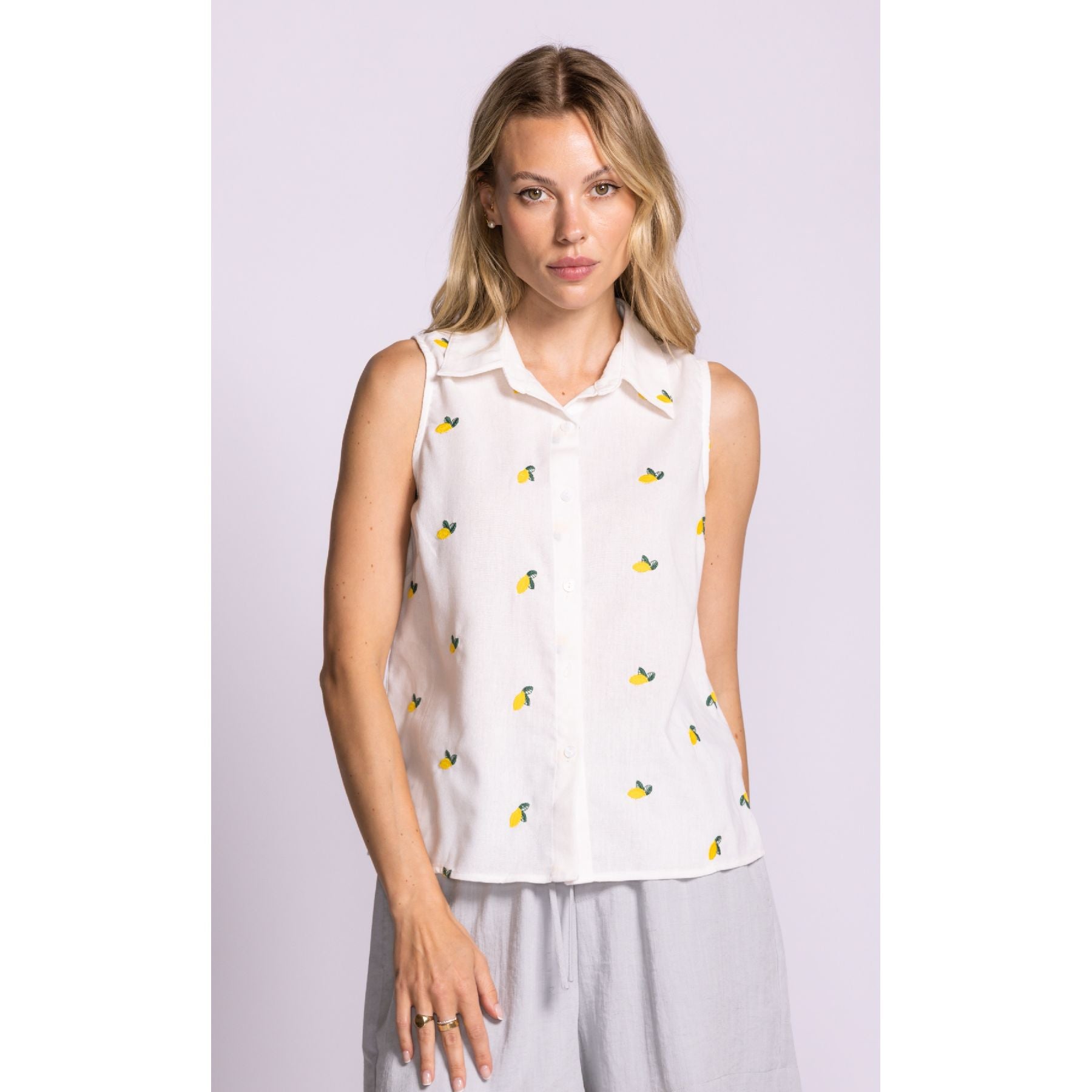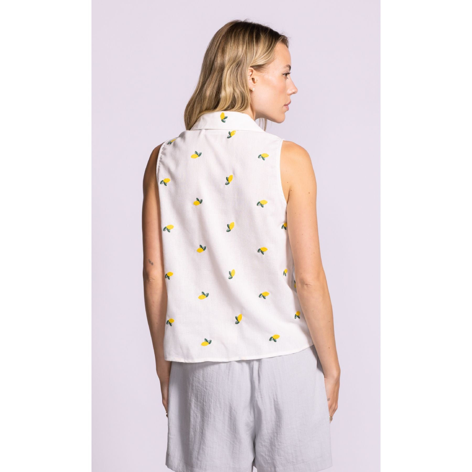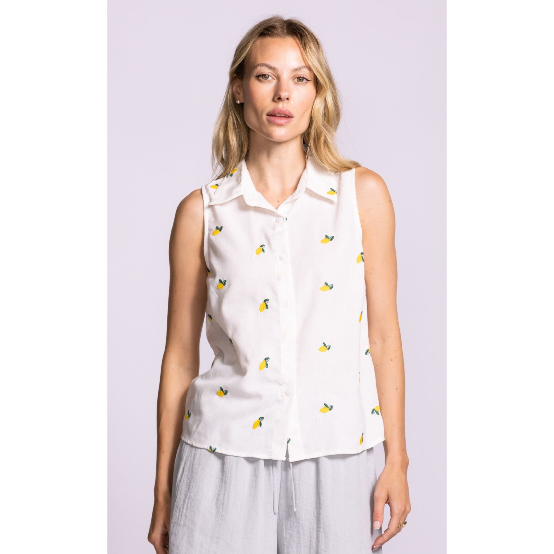 Light, playful, and just a little bit charming, this sleeveless button-up brings an easy summer energy to your wardrobe. The airy fabric keeps things breathable, while the delicate all-over lemon print adds a fresh, feel-good twist. Finished with a soft collar and clean silhouette, it’s the kind of piece that works effortlessly with linen shorts, denim, or anything that calls for a hint of sunshine.