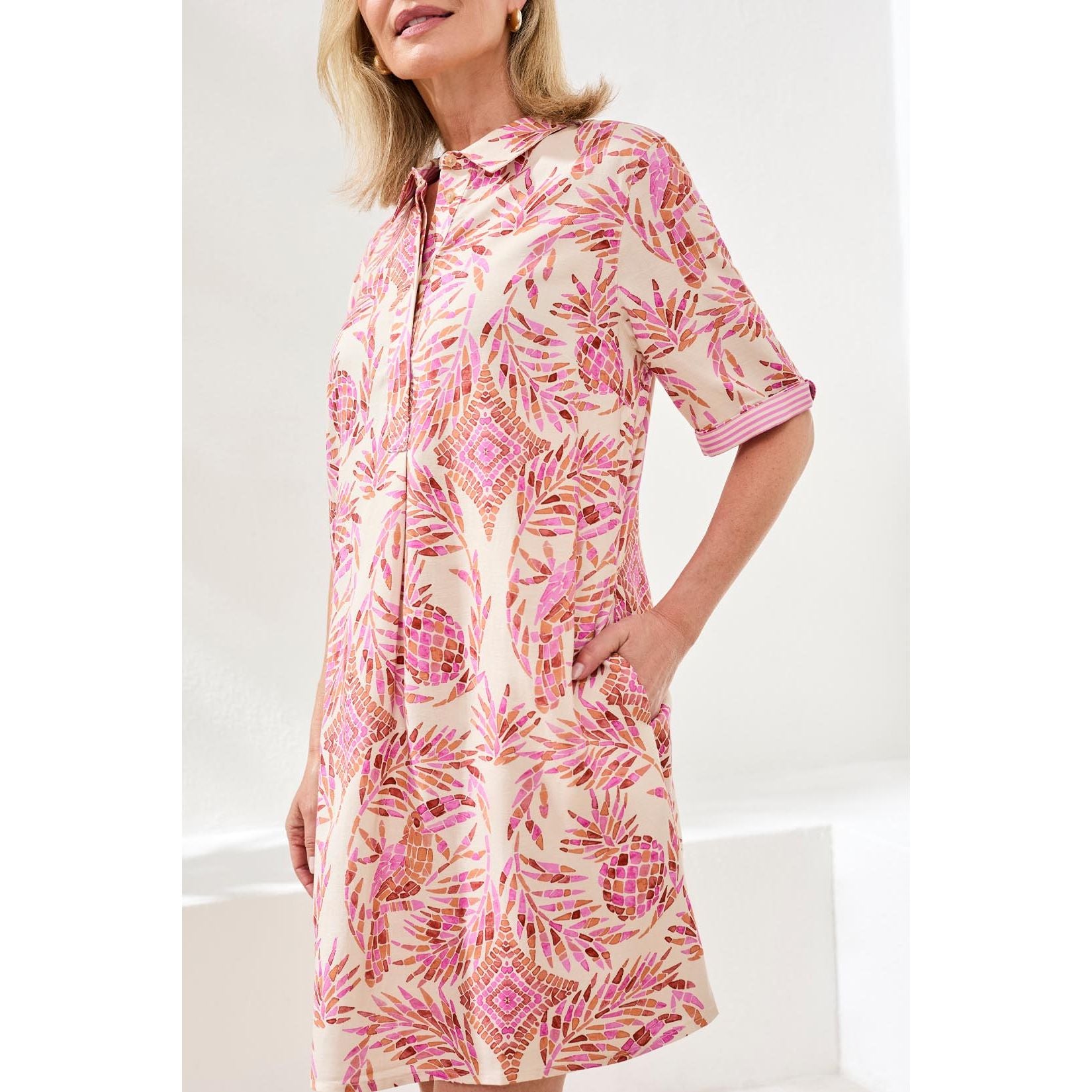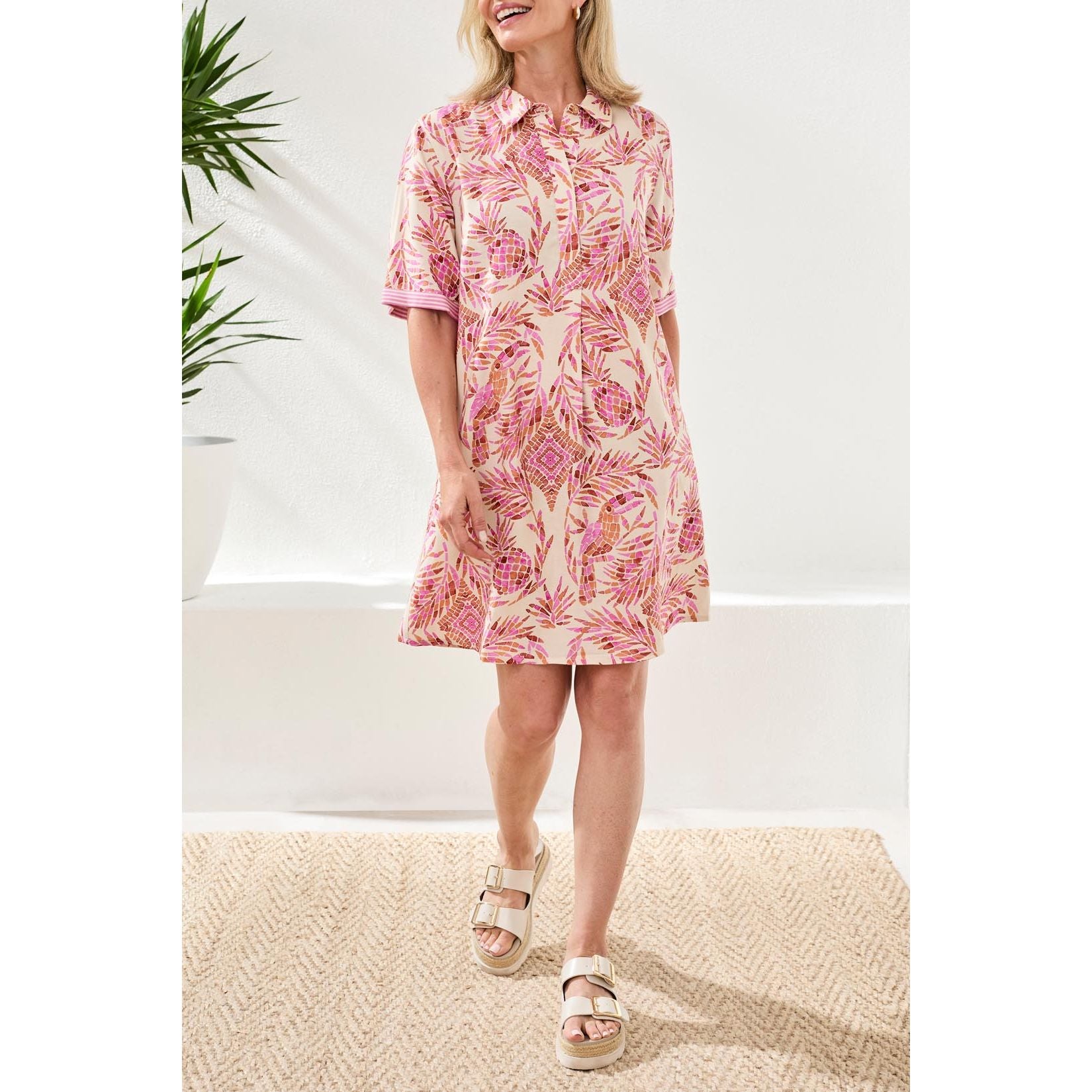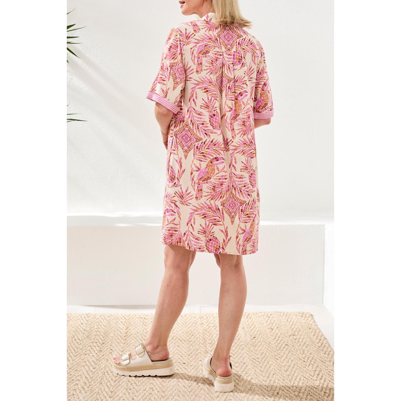 Cette robe, ornée d'un imprimé raffiné et dotée d'une fermeture boutonnée facile à enfiler, est confectionnée dans un mélange de lin et de rayonne de qualité supérieure, offrant un toucher doux et un drapé élégant. Sa coupe fluide garantit un confort optimal tout au long de la journée et une allure soignée, idéale pour toutes vos sorties en vacances.
